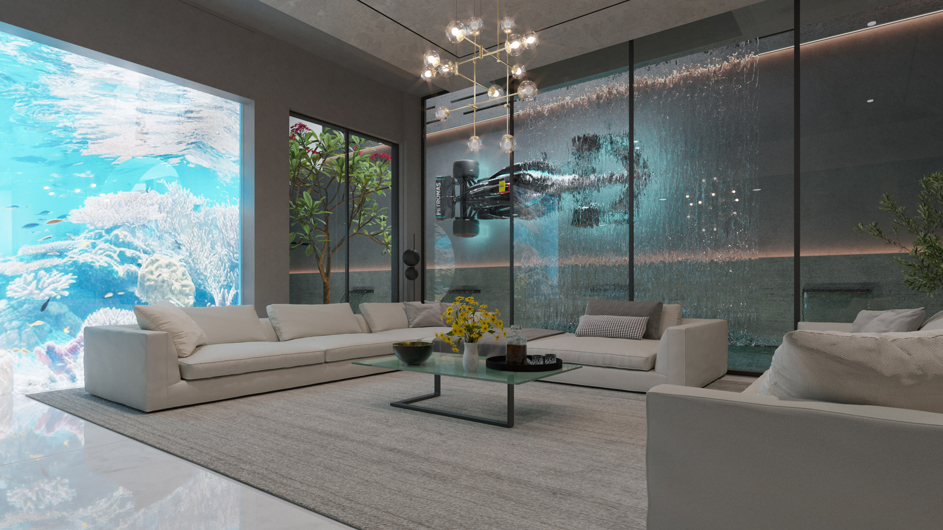 The distinctive client’s brief calls for a number of specialised building features for the project including a 4.5m high, 2.6m x 4.5m freestanding fish tank nestled between the main living & tv areas and a tempered glass floor in the bar area overlooking the pool. 4.2m full height glazed sliding folding doors are used to dematerialize the boundary between house and terrace and seamlessly merge the expansive living spaces with the lush, landscaped rear garden to form a natural and fluid extension of the interiors in quintessential tropical tradition. The design team is collaborating closely with specialist sub-contractors and suppliers from both Sri Lanka and India to bring the envisioned design to life.